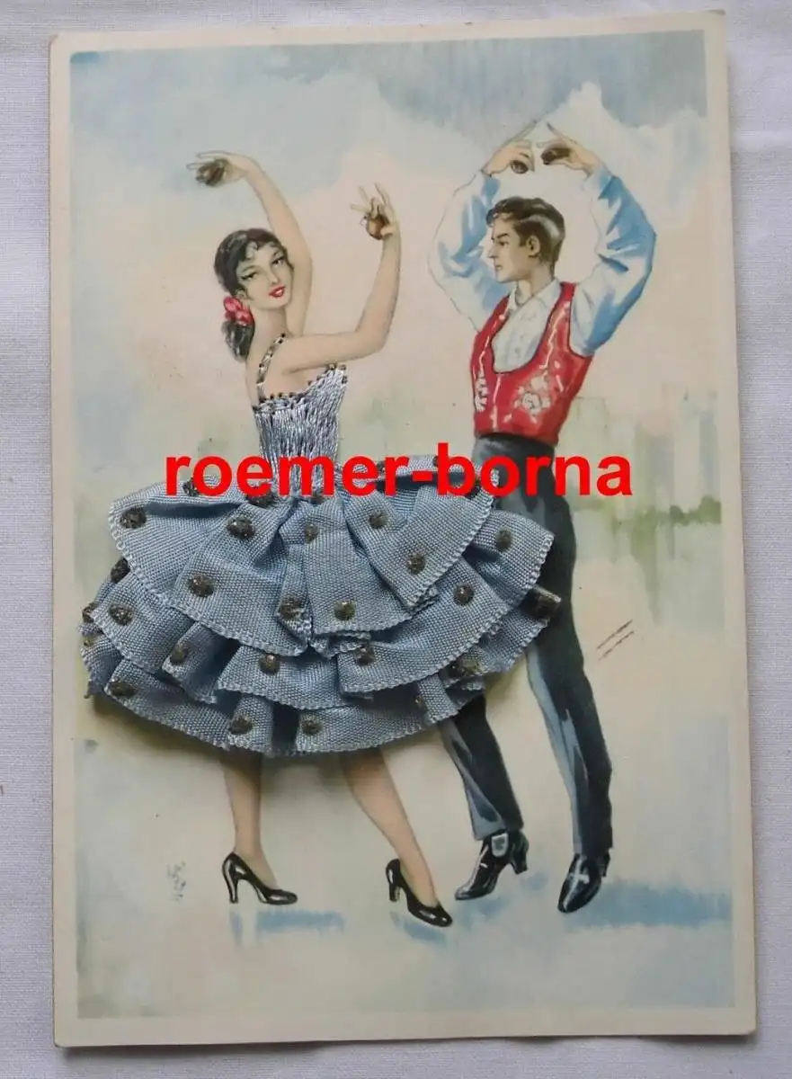 sehr schöne Postkarte made in Spain Patente no. 46372 das Oberteil am Kleid der Frau ist gestickt und der üppige Rock aus textilem Stoff gestaltet ungelaufen guter Zustand, geringe Altersspuren, siehe Bild