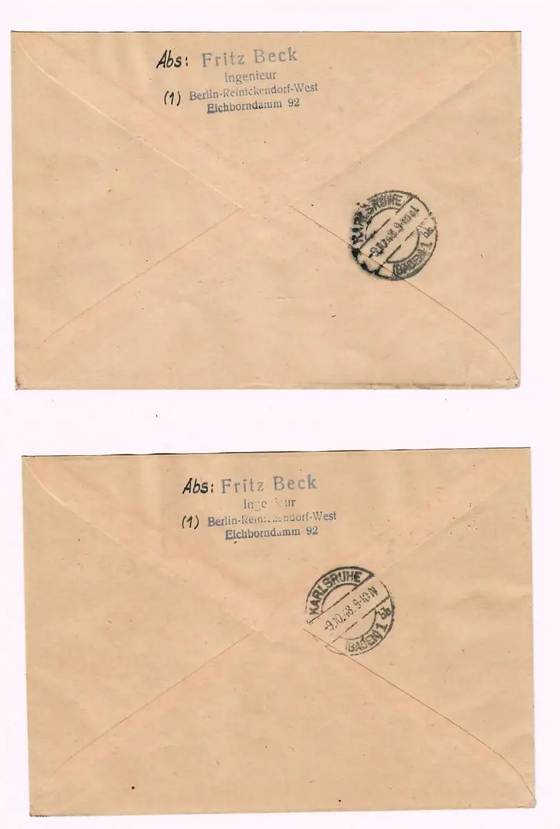 7x Einschreibebriefe Berlin 1948, Luftbrücke Werbung, MiNr. 1-20 nach Karlsruhe