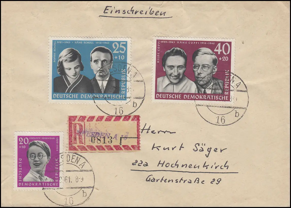 851+852+853 Widerstandskämpfer Scholl R-Brief Not-R-Zettel DRESDEN 20.9.1961