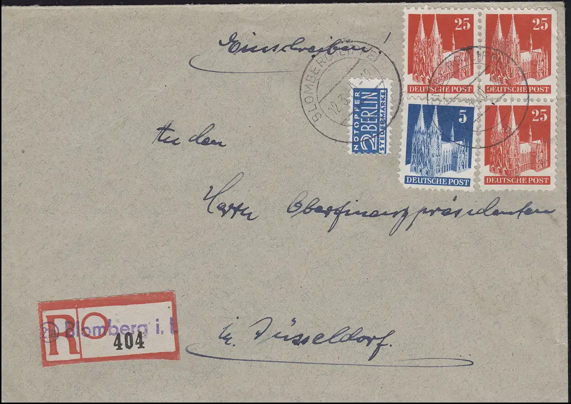 87wg Bauten 3mal 25 Pf mit 75wg + Notopfer Not-R-Zettel BLOMBERG (LIPPE) 12.3.50