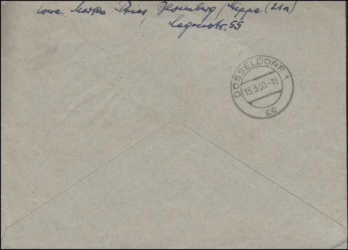Fern-Einschreiben mit Ankunftsstempel DÜSSELDORF 13.3.50