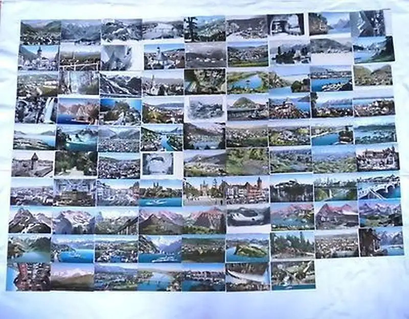 Dabei St.Moritz, Collalba, Montreux, Sorpis, Interlaken, Jungfrau, Gardone, Lago di Como, Luzern, Lago di Garda, Torbole, Riva, Gwächtenhorn, Bozen Gries Basel, Bern, Mariastein, Mürren, Kleine Scheidegg, Eiger, Mönch, Harderkulm, Brunnen, Uristock, Niesen Bahn, Säntis, Lörrach, Tellskapelle, Aarau, Vierwaldstätter See, Flüelen, St.Gotthard, Brienzersee, Solothurn, Le Mont Blanc, St.Gallen, Davos, Rheinfall, Schaffhausen, Zürich, Olten, Locarno, Lugano, Biel, Lausanne, Neuchatel, Küssnacht, Fribourg, Chur, Cortina d´Ampezzo, Altdorf, Baden, La Chaux de Fonds, Axenstrasse, Berneroberland, Rigi-Kulm usw. davon 12 Karten (bei 7 Karten ist die Briefmarke ab) gelaufen, gute Erhaltung siehe Bild,