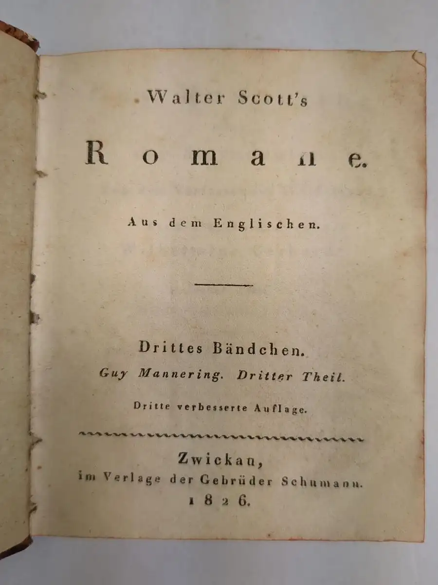Bemerkungen: Zustand: Einbände berieben, besonders Ecken und Kanten, Papier stellenweise etwas braunfleckig // Kleines Format, kleine Schrift (in Antiqua)! Das Konvolut beinhaltet: Guy Mannering Teil 3-5, Der Seeräuber Teil 3-5, Die Braut Teil 1-3, Peveril Teil 1-3 + 4-5, St. Ronan's Brunnen Teil 3-4, Redgauntlet Teil 1-2 + 3-4, Chronik von Canongate Teil 1-3.