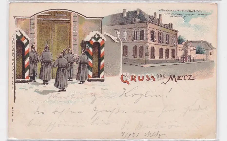 908167 Lithographie Ak Gruss aus Metz - Wohnungsr.Ex. Graf v. Haeseler 1901