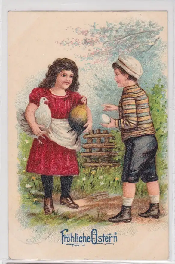 908481 geprägte Ak Fröhliche Ostern - Jung und Mädchen mit 2 Hühnern 1909