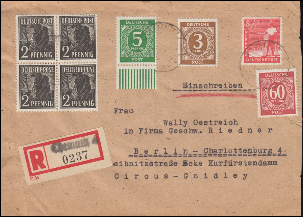 913ff Kontrollrat I+II als MiF R-Brief Not-R-Zettel CHEMNITZ 4 nach BERLIN 1947