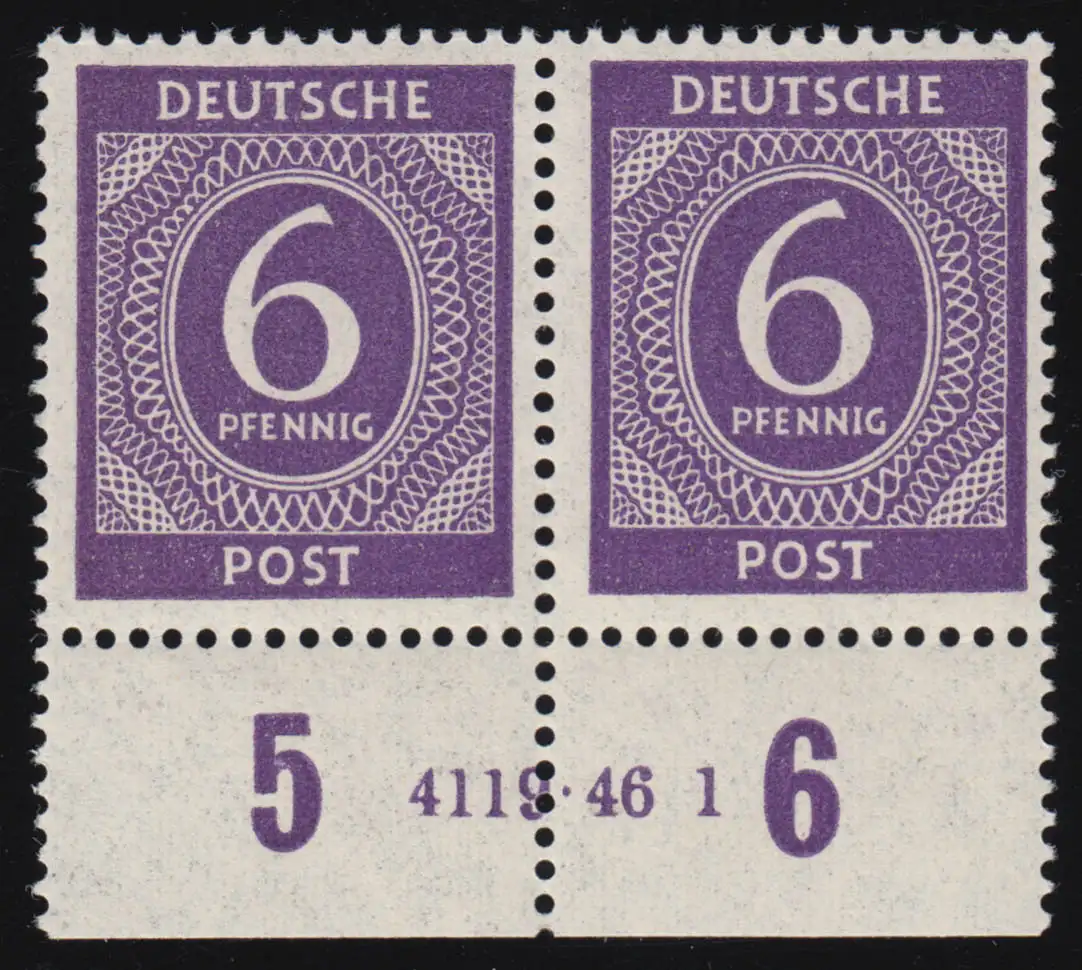 916 Ziffer 6 Pf als Unterrand-Paar mit HAN 4119.46 1, ungefaltet postfrisch **