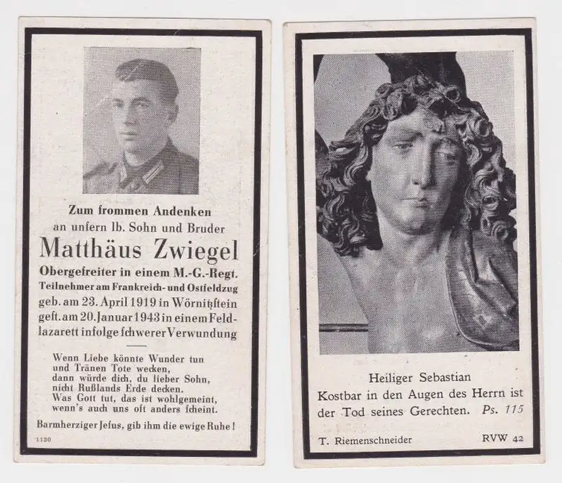 91660 Sterbebild WK2 MG-Regiment gefallen 1943 Feldlazarett infolge Verwundung