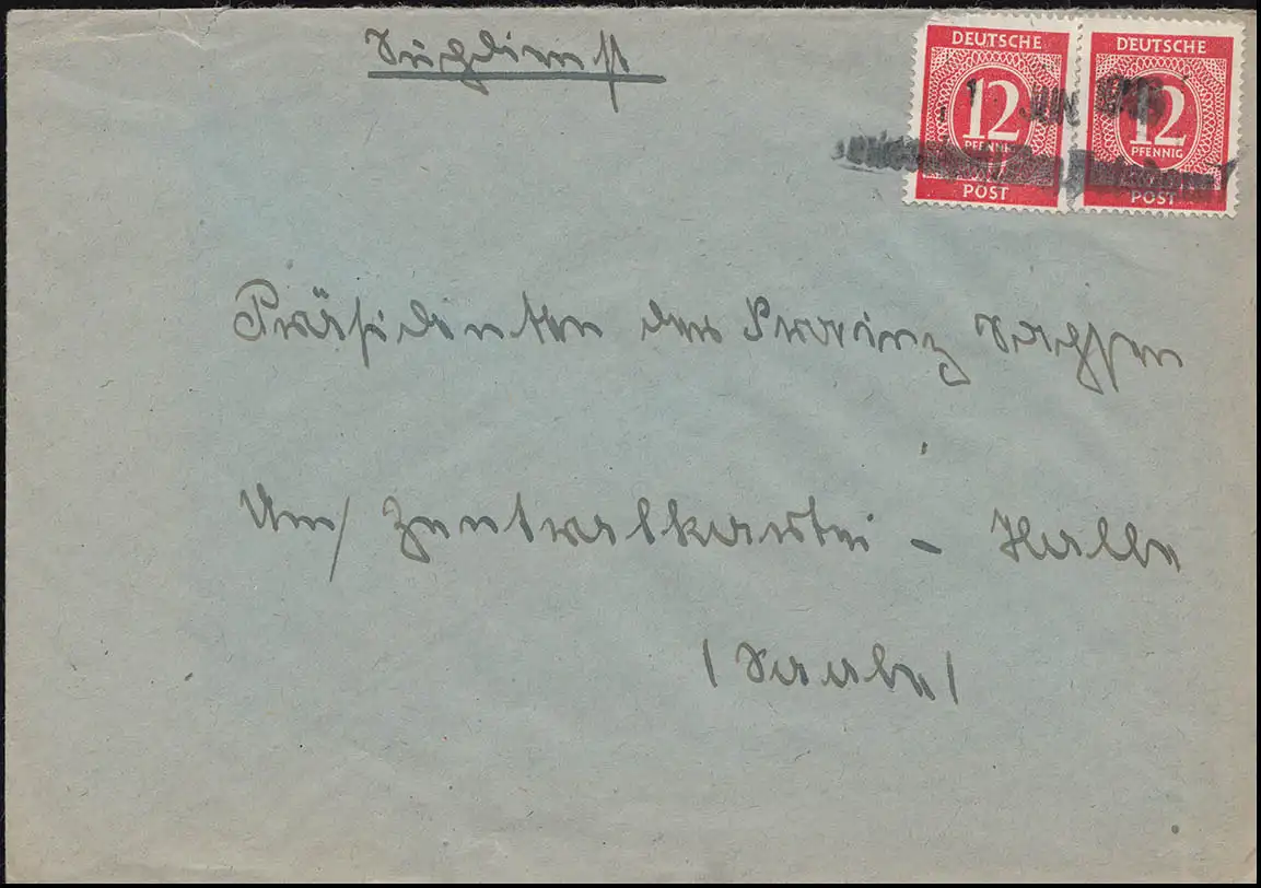 919 Ziffer 12 Pf. MiF auf Brief Zweizeiler 1. JUN. 1948 / ? Bez. Potsdam