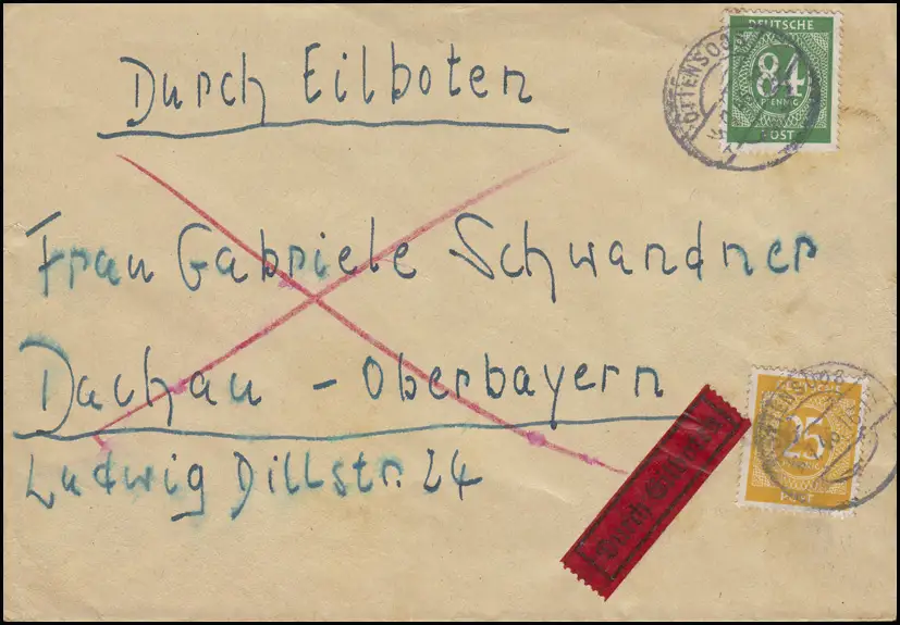 926+936 Ziffern 25+84 Pf. MiF Eil-Brief OTTENSOOS 6.7.46 nach Dachau