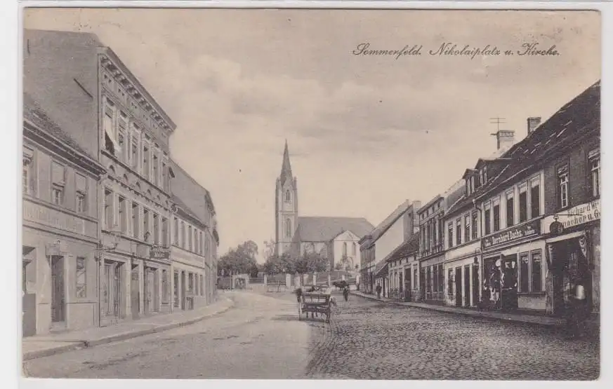 94042 Ak Sommerfeld Nikolaiplatz an der Kirche mit Geschäften 1910