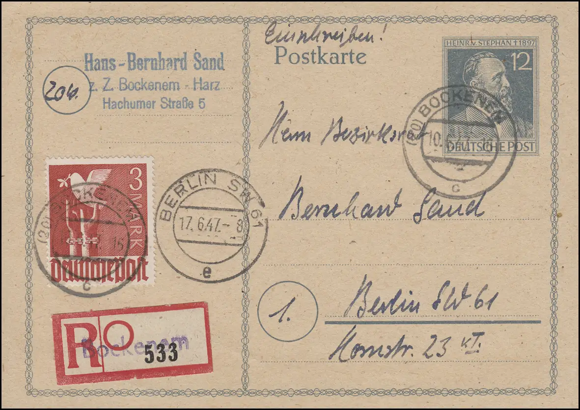 961 Taube 3 Mark auf Ganzsache P 965 Stephan Not-R-Zettel BOCKENEM 10.6.47