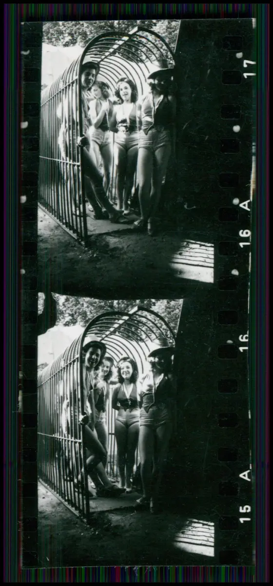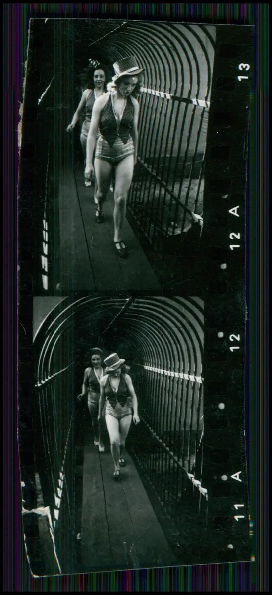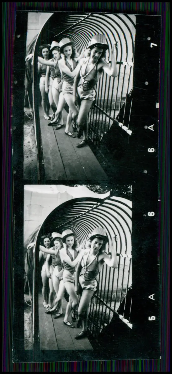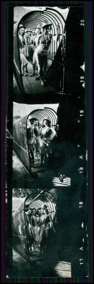 9x Foto 4x3cm - Frauen in Badeanzügen - im Zirkus Tunnel Tigerkäfig zur Manege