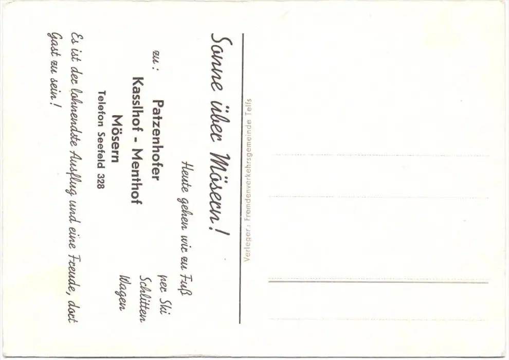 A 6100 TELFS - MÖSERN, Werbe-Karte Patzenhofer Kasslhof-Menthof