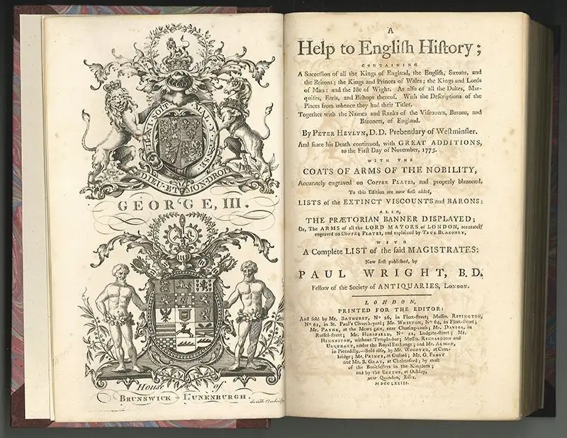 ArtikeldetailsA Help to English History; containing A Succession of all the Kings of England, Saxons, and the Britons; the Kings and Princes of Wales; the Kings and Lords of Man: and Isle of Wight. As also of the Dukes, Marquises, Earls, and Bishops thereof. With the Descriptions of the Places from whence they had their Titles. […] With the coats of arms of the nobility. […] Now first published by Paul Wright. HEYLYN, Peter.