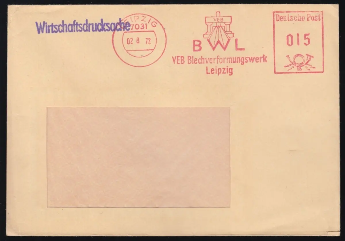 AbsenderfreistempelBWL, VEB Blechverformungswerk Leipzig Abbildungen: Betriebssignet Absender: VEB Blechverformungswerk Leipzig Empfänger: unbekannt, Fensterbrief Nebenstempel: Wirtschaftsdrucksache Anmerkungen: keine Im Inland erfolgt die Zusendung versandkostenfrei als Briefsendung der Deutschen Post AG oder eines privaten Postanbieters. Auslandsversand erfolgt über