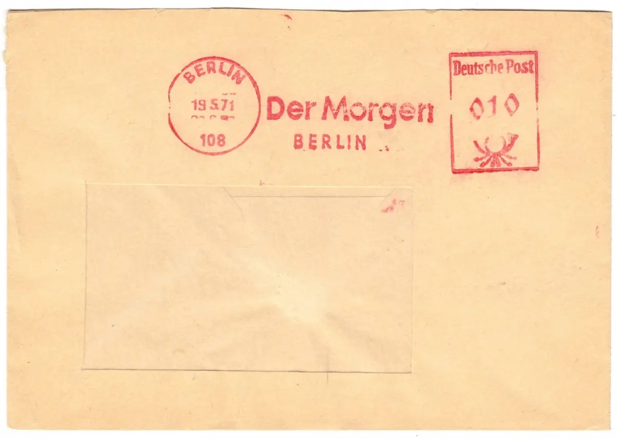 AbsenderfreistempelDer Morgen, Berlin [Verlag] Abbildungen: keine Absender: Der Morgen, Berlin Empfänger: unbekannt, Fensterbrief Nebenstempel: keine Anmerkungen: rückseitig kleine handschriftl. Vermerk Im Inland erfolgt die Zusendung versandkostenfrei als Briefsendung der Deutschen Post AG oder eines privaten Postanbieters. Auslandsversand erfolgt über