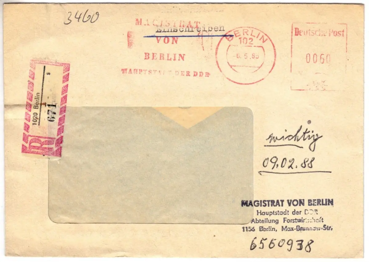 Absenderfreistempel, EinschreibenMagistrat von Berlin Hauptstadt der DDR Abbildungen: keine Absender: Magistrat von Berlin Hauptstadt der DDR, Abt. Forstwirtschaft, 1156 Berlin, Max-Brunnow-Str. Empfänger: unbekannt, Fensterbrief Nebenstempel: keine Anmerkungen: keine Im Inland erfolgt die Zusendung versandkostenfrei als Briefsendung der Deutschen Post AG oder eines privaten Postanbieters. Auslandsversand erfolgt über