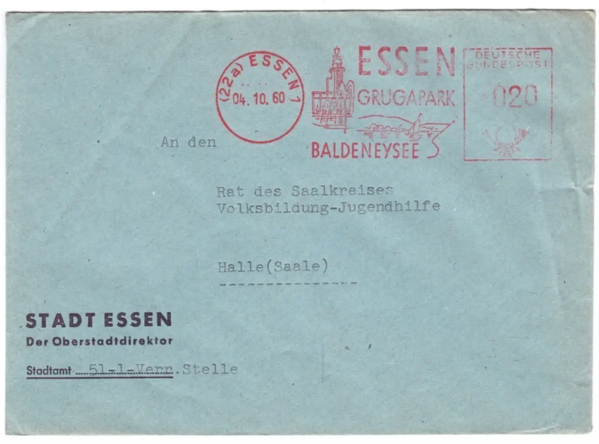 Abbildungen: Grugaturm und See Absender: Stadt Essen, Der Oberstadtdirektor Empfänger: Rat des Saalkreises, Volksbildung - Jugendhilfe, Halle (Saale) Porto: 0,20 Nebenstempel: keine Anmerkungen: keine