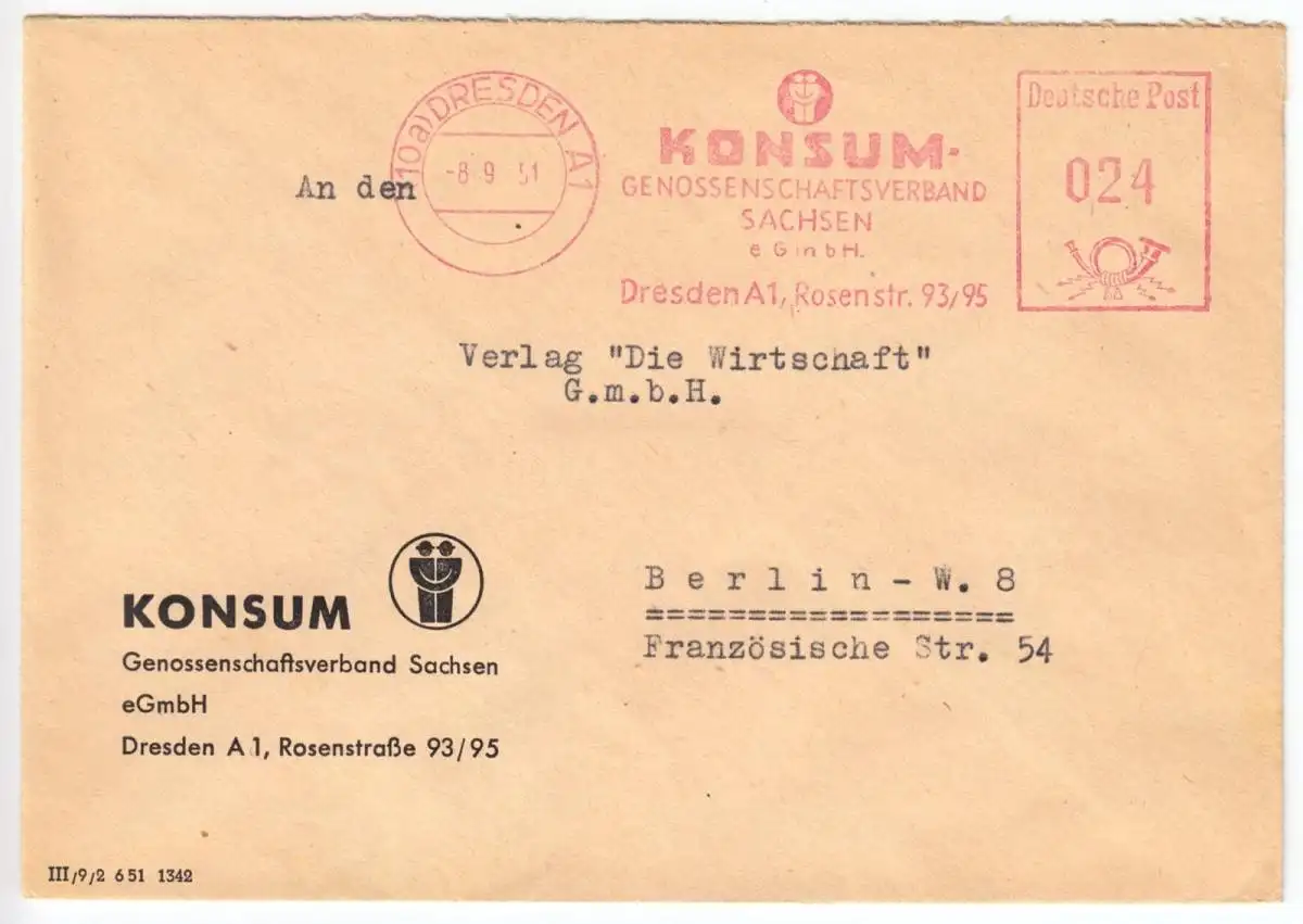 AbsenderfreistempelKonsum-Genossenschaftsverband Sachsen eGmbH, Dresden A1, Rosenstr. 93/95 Abbildungen: Firmensignet Absender: Konsum-Genossenschaftsverband Sachsen eGmbH, Dresden A1, Rosenstr. 93/95 Empfänger: Verlag "Die Wirtschaft" GmbH, Berlin W8, Französische Str. 54 Nebenstempel: keine Anmerkungen: keine Im Inland erfolgt die Zusendung versandkostenfrei als Briefsendung der Deutschen Post AG oder eines privaten Postanbieters. Auslandsversand erfolgt über