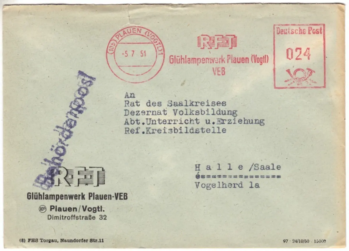 Absenderfreistempel Abbildungen: keine Absender: RFT Glühlampenwerk Plauen-VEB Empfänger: Rat des Saalkreises, Dezernat Volksbildunf, Abt. Unterricht u. Erziehung, Ref. Kreisbildstelle Porto: 0,24 Nebenstempel: Behördenpost Anmerkungen: kleiner Einriss an der oberen Kante
