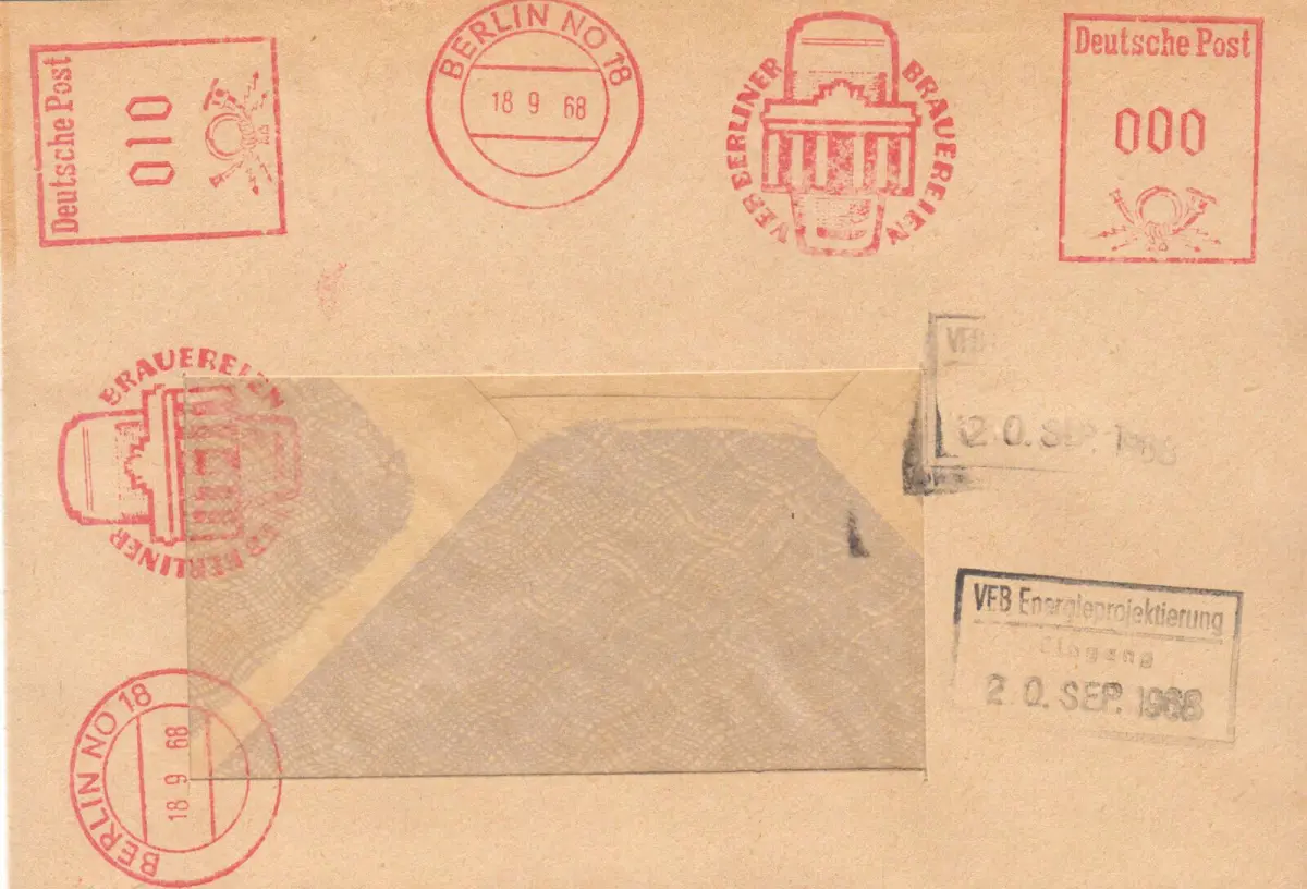 Absender: VEB Berliner Brauereien Empfänger: unbekannt, Fensterbrief Nebenstempel: Eingangsstempel: VEB Energieprojektierung Anmerkungen: zwei Freistempelabschäge, einer 0,00 Der