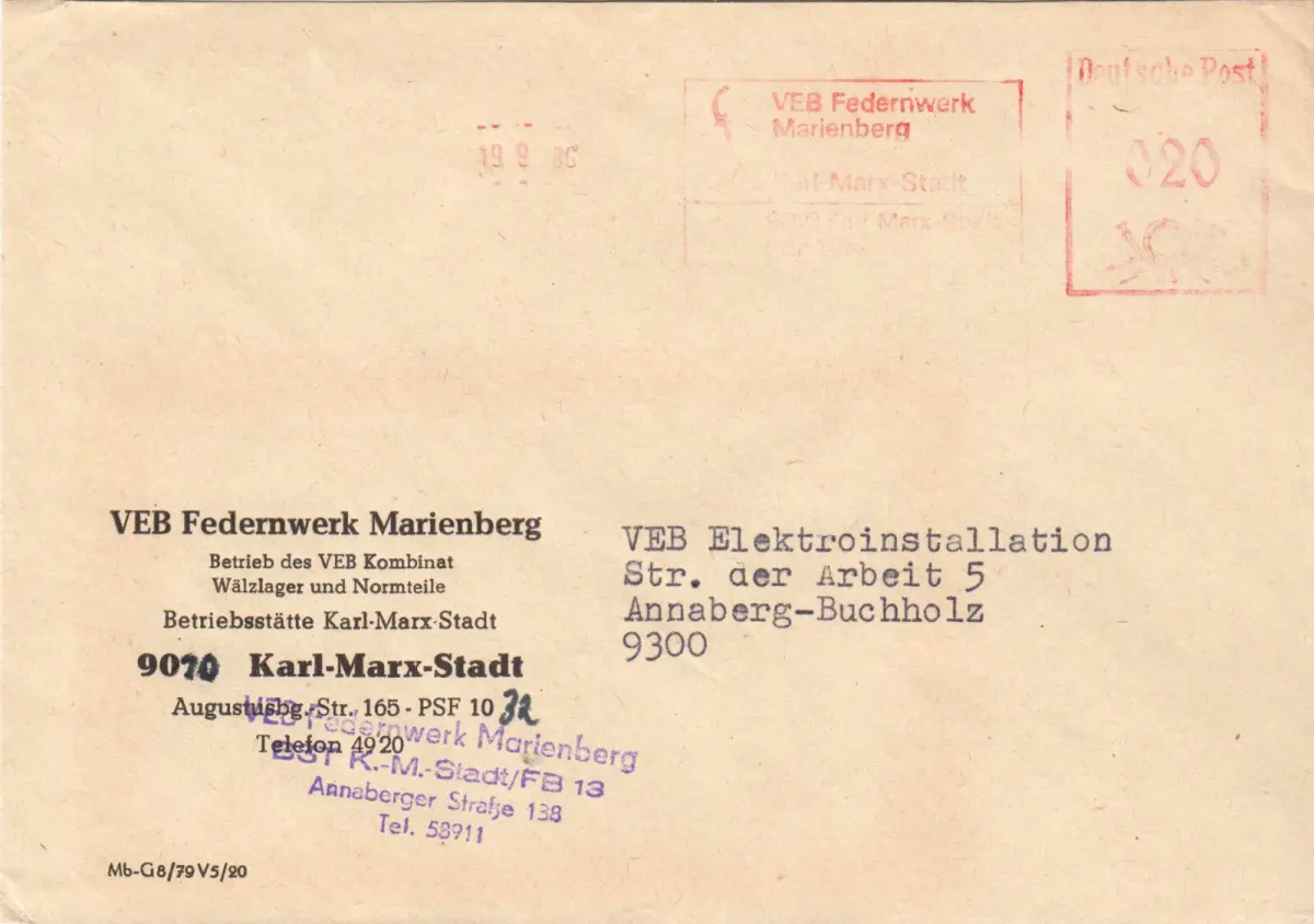 Absenderfreistempel Abbildungen: Firmensignet Absender: VEB Federnwerk Marienberg, Betrieb des VEB Kombinat Wälzlager und Normteile, Betriebsstätte 9010 Karl-Marx-Stadt, Augustusbg. Str. 165 Empfänger: VEB Elektroinstallation, Str. der Arbeit 5, Annaberg-Buchholz, 9300 Nebenstempel: keine Anmerkungen: Tagesstempel aptiert Der