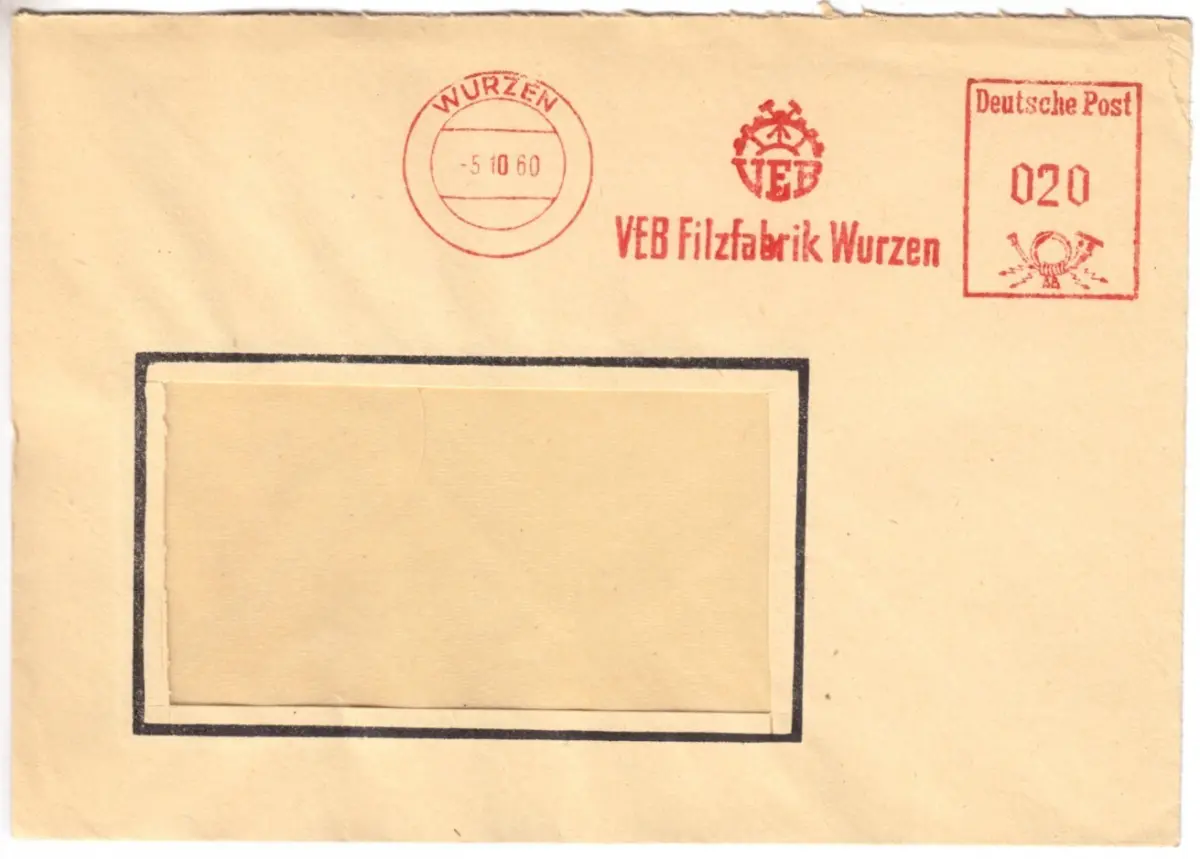 AbsenderfreistempelVEB Filzfabrik Wurzen Abbildungen: VEB-Signet Absender: VEB Filzfabrik Wurzen Empfänger: unbekannt, Fensterbrief Nebenstempel: keine Anmerkungen: keine Im Inland erfolgt die Zusendung versandkostenfrei als Briefsendung der Deutschen Post AG oder eines privaten Postanbieters. Auslandsversand erfolgt über