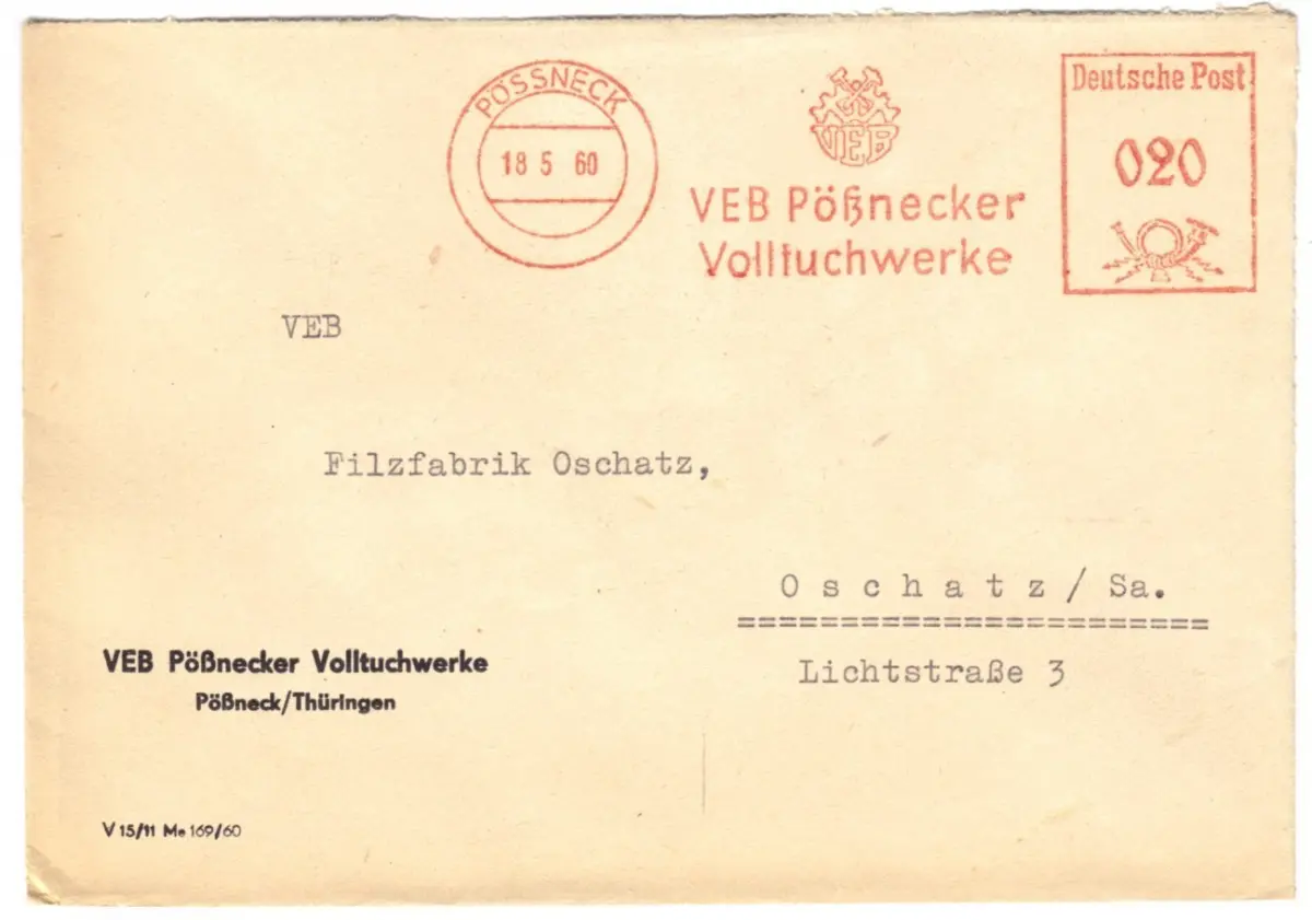 AbsenderfreistempelVEB Pößnecker Volltuchwerke Abbildungen: VEB-Signet Absender: VEB Pößnecker Volltuchwerke, Pößneck Thüringen Empfänger: VEB Filzfabrik Oschatz, Oschatz Sa., Lichtstr. 3 Nebenstempel: keine Anmerkungen: keine Im Inland erfolgt die Zusendung versandkostenfrei als Briefsendung der Deutschen Post AG oder eines privaten Postanbieters. Auslandsversand erfolgt über