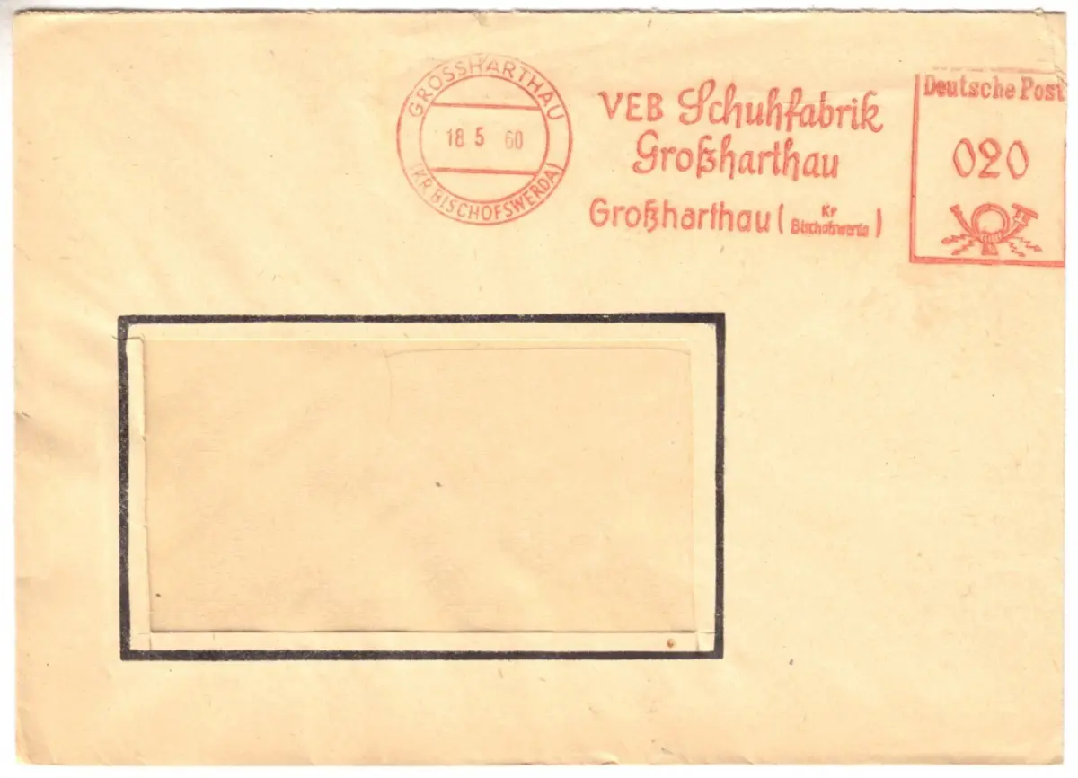 AbsenderfreistempelVEB Schuhfabrik Großharthau, Grassharthau (Kr. Bischofswerda) Abbildungen: keine Absender: VEB Schuhfabrik Großharthau Empfänger: unbekannt, Fensterbrief Nebenstempel: keine Anmerkungen: keine Im Inland erfolgt die Zusendung versandkostenfrei als Briefsendung der Deutschen Post AG oder eines privaten Postanbieters. Auslandsversand erfolgt über