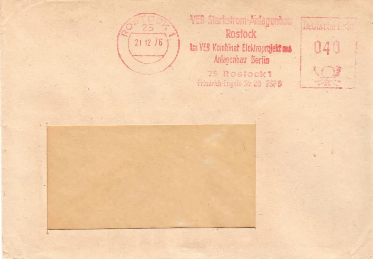 Absenderfreistempel Abbildungen: keine Absender: VEB Starkstromanlagenbau Rostock im VEB Kombinat Elektroprojekt und Anlagenbau Berlin, 25 Rostock 1, Friedrich-Engels-Str. 28 Empfänger: unbekannt, Fensterbrief Nebenstempel: keine Anmerkungen: keine Der