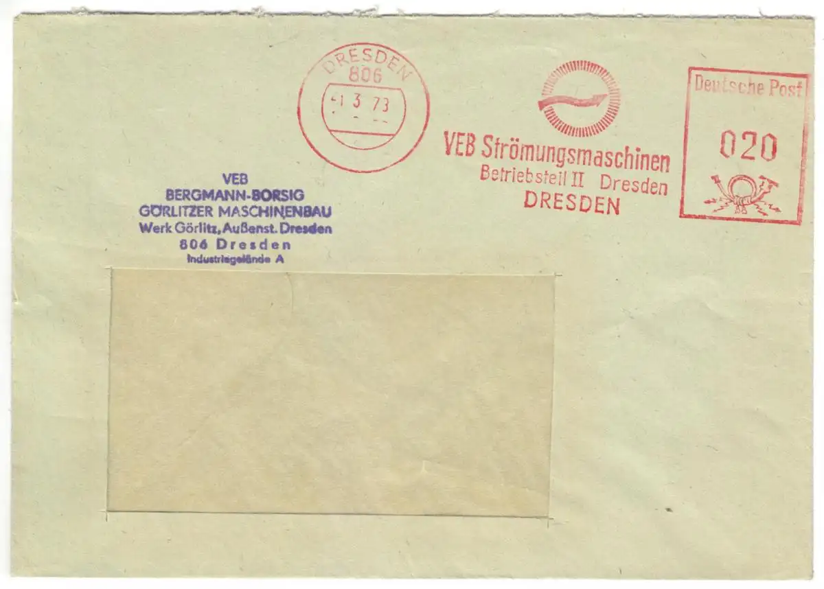 Absenderfreistempel Abbildungen: Betriebssignet Absender: VEB Bergmann-Borsig, Görlitzer Maschinenbau, Werk Görlitz, Außenst. Dresden, 806 Dresden, Industriegelände A Empfänger: unbekannt, FensterbriefPorto: 020 Nebenstempel: keine Anmerkungen: keine Im Inland erfolgt die Zusendung versandkostenfrei als Briefsendung der Deutschen Post AG oder eines privaten Postanbieters. Auslandsversand