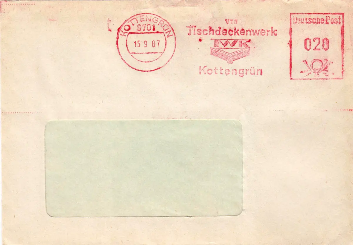 Absenderfreistempel Abbildungen: Betriebssignet Absender: VEB Tischdeckenwerk Kottengrün Empfänger: unbekannt, Fensterbrief Nebenstempel: keine Anmerkungen: keine Der