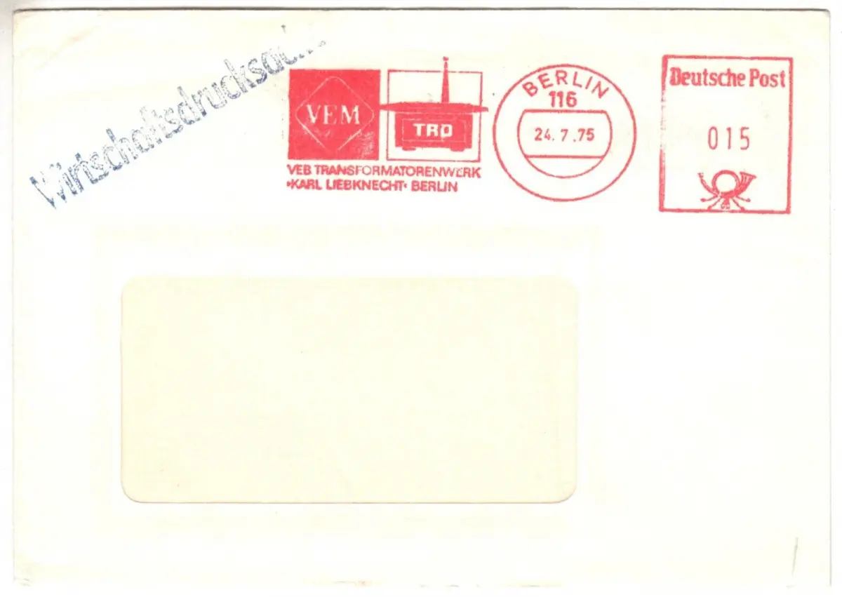 AbsenderfreistempelVEB Transformatorenwerk "Karl-Liebknecht" Berlin Abbildungen: Betriebssignet Absender: VEB Transformatorenwerk "Karl-Liebknecht" Berlin Empfänger: unbekannt, Fensterbrief Nebenstempel: Wirtschaftsdrucksache Anmerkungen: keine Im Inland erfolgt die Zusendung versandkostenfrei als Briefsendung der Deutschen Post AG oder eines privaten Postanbieters. Auslandsversand erfolgt über