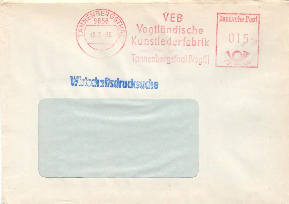 Absenderfreistempel Abbildungen: keine Absender: VEB Vogtländische Kunstlederfabrik Tannenbergsthal (Vogtl) Empfänger: unbekannt, Fensterbrief Nebenstempel: Wirtschaftsdrucksache Anmerkungen: keine Der