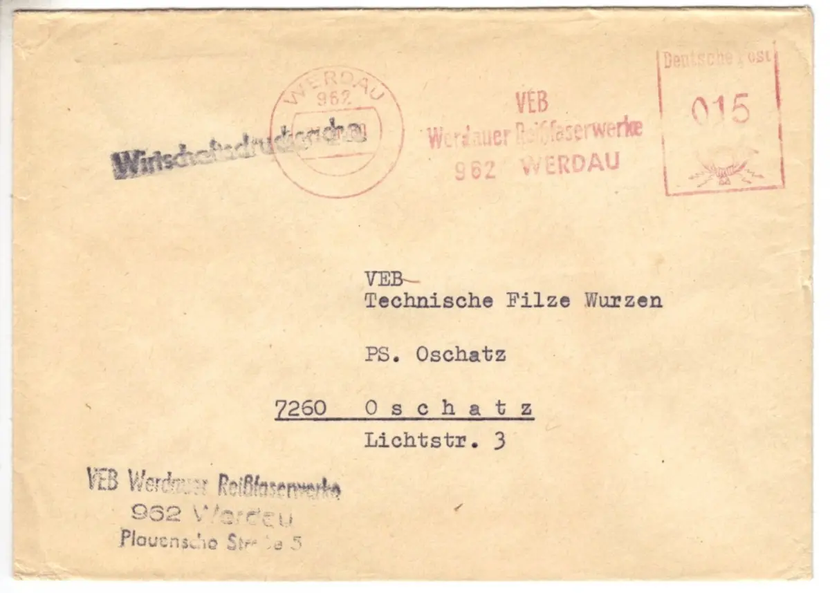 AbsenderfreistempelVEB Werdauer Reißfaserwerke, 962 Werdau Abbildungen: keine Absender: VEB Werdauer Reißfaserwerke, 962 Werdau, Plauensche Str. 5 Empfänger: VEB Technische Filze Wurzen, PS Oschatz, 7260 Oschatz, Lichtstr. 3 Nebenstempel: Wirtschaftsdrucksache Anmerkungen: keine Im Inland erfolgt die Zusendung versandkostenfrei als Briefsendung der Deutschen Post AG oder eines privaten Postanbieters. Auslandsversand erfolgt über