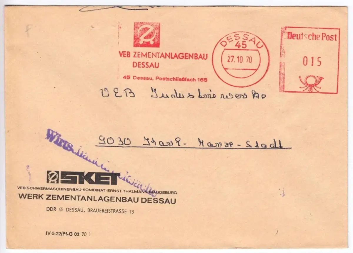 AbsenderfreistempelVEB Zementanlagenbau Dessau, 45 Dessau, PSF 165 Abbildungen: Firmensignet Absender: SKET, VEB Schwermaschinenbau-Kombinat Ernst Thälmann Magdeburg, Werk Zementanlagenbau Dessau, DDr 45 Dessau, Brauereistr. 13 Empfänger: VEB Industriewerke, 9030 Karl-Marx-Stadt Nebenstempel: Wirtschaftsdrucksache Anmerkungen: keine Im Inland erfolgt die Zusendung versandkostenfrei als Briefsendung der Deutschen Post AG oder eines privaten Postanbieters. Auslandsversand erfolgt über