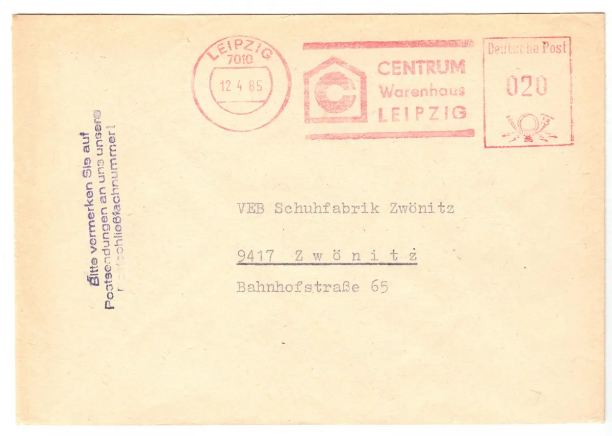 Absenderfreistempel rot Abbildungen: Signet Absender: Centrum Warenhaus Leipzig Empfänger: VEB Schuhfabik Zwönitz, 9417 Zwönitz, Bahnhofstr. 65 Nebenstempel: Bitte vermerken Sie auf Postsendungen an uns unsere Postschließfachnummer! Anmerkungen: keine Der