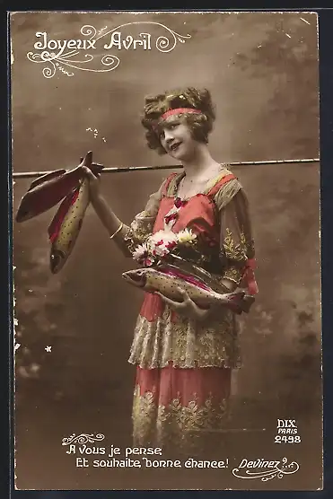 AK 1. April, Dame mit Fischen und Blumen in den Händen
