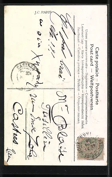 Personenbezogene Daten auf der Rückseite der Karte wurden durch blauen Textmarker unkenntlich gemacht. Die blauen Stellen sind auf die Vorderseite durchgeweicht und wirken sich negativ auf das Postkartenfoto aus