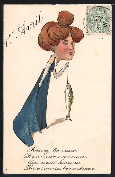 AK 1. April, Frau trägt einen Fisch an einer Schnur