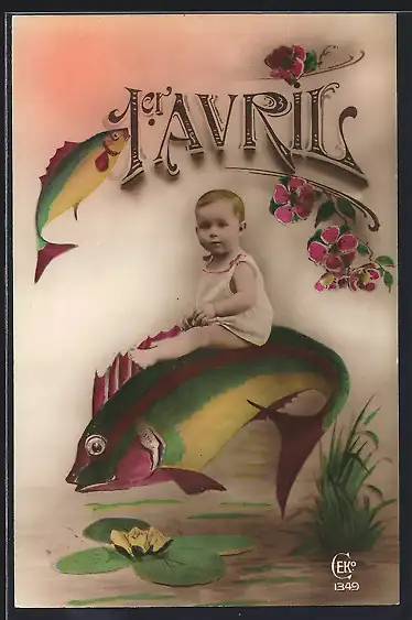 AK 1. April, Kleinkind reitet auf einem Fisch