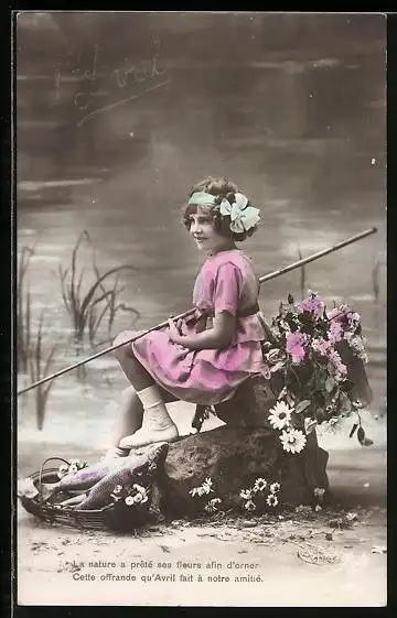 AK 1. April, Mädchen sitzt angelnd am Ufer