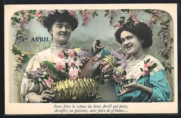 AK 1. April, Zwei Damen mit Fischen und Blumen