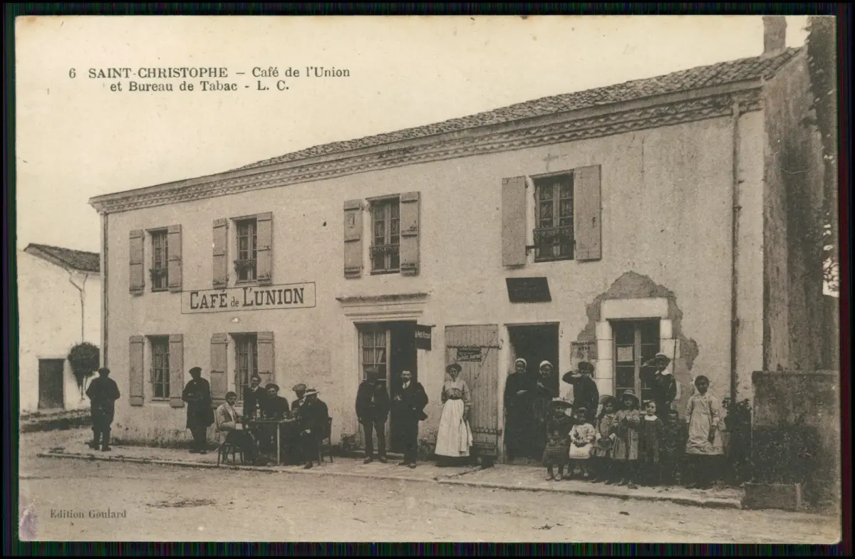 Der Ort Saint-Christophe (es gibt mehrere in Frankreich, vermutlich Département Charente oder Deux-Sèvres) war ein typisches ländliches Zentrum mit Gasthaus, Kolonialwaren und Tabakverkauf. Solche Einrichtungen dienten als Treffpunkt für die Dorfbevölkerung – auch als Post- oder Informationsstelle.