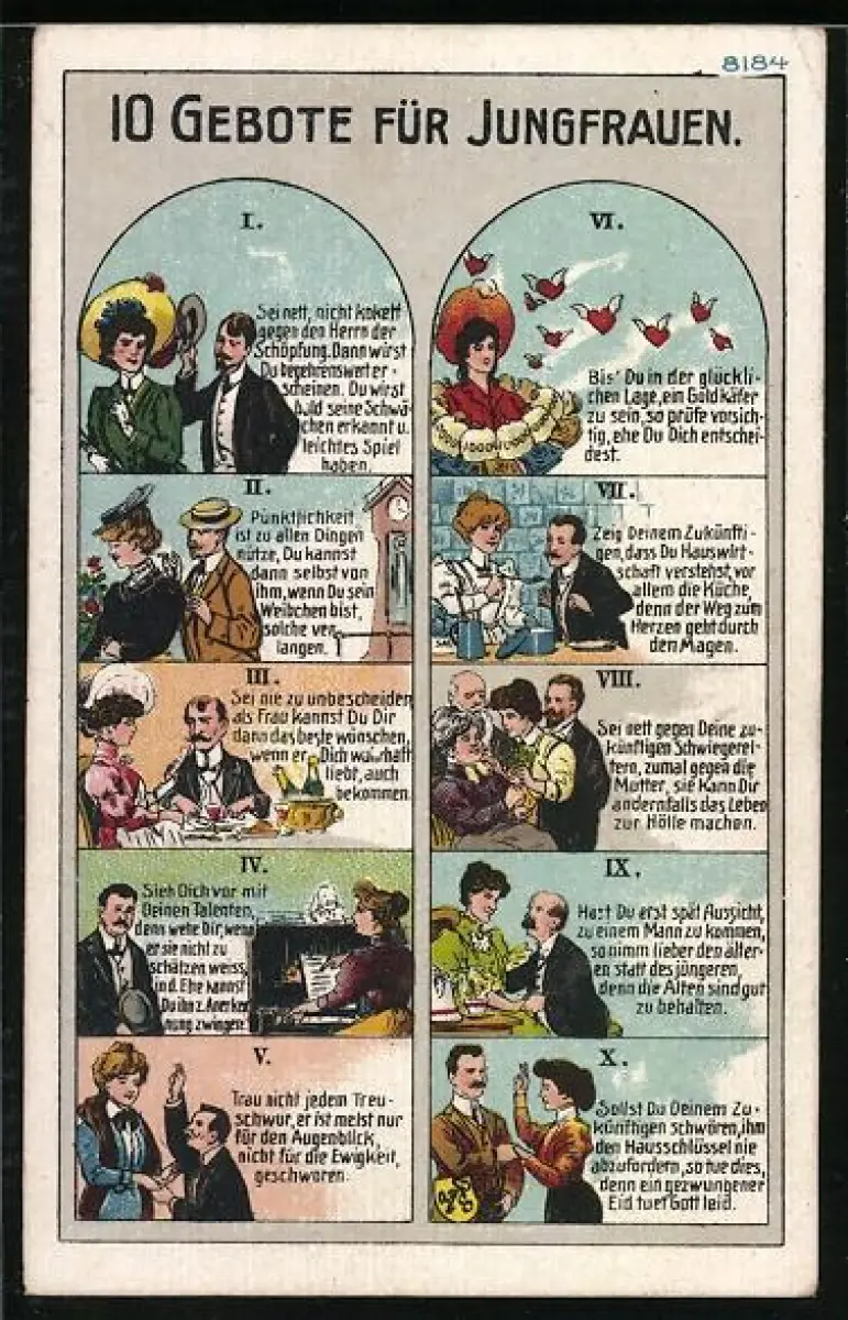 AK 10 Gebote für Jungfrauen, Bildtafeln, Humor