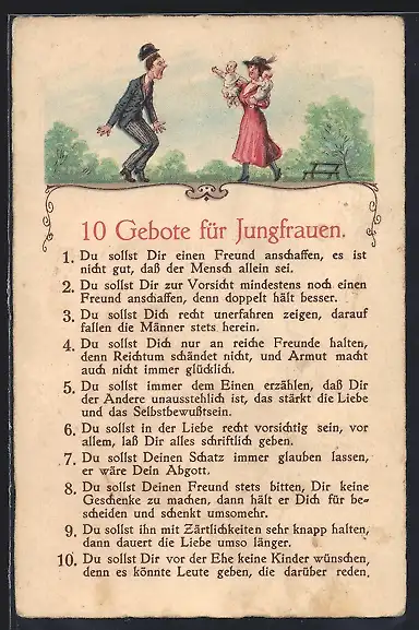 AK 10 Gebote für Jungfrauen, frauenfeindlicher Humor