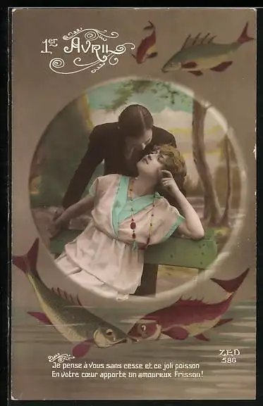 AK 1.April, Mann und Frau an einer Bank mit Fischen umgeben