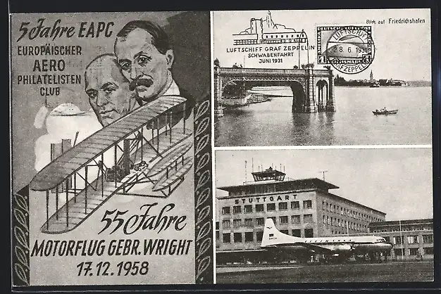 AK 55 Jahre Motorflug Gebr. Wright 1958, Stuttgart, Flughafen, Friedrichshafen, Zeppelin-Schwabenfahrt 1931, EAPC