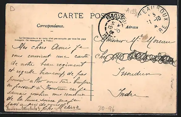 Personenbezogene Daten auf der Rückseite der Karte wurden durch blauen Textmarker unkenntlich gemacht. Die blauen Stellen sind auf die Vorderseite durchgeweicht und wirken sich negativ auf das Postkartenfoto aus